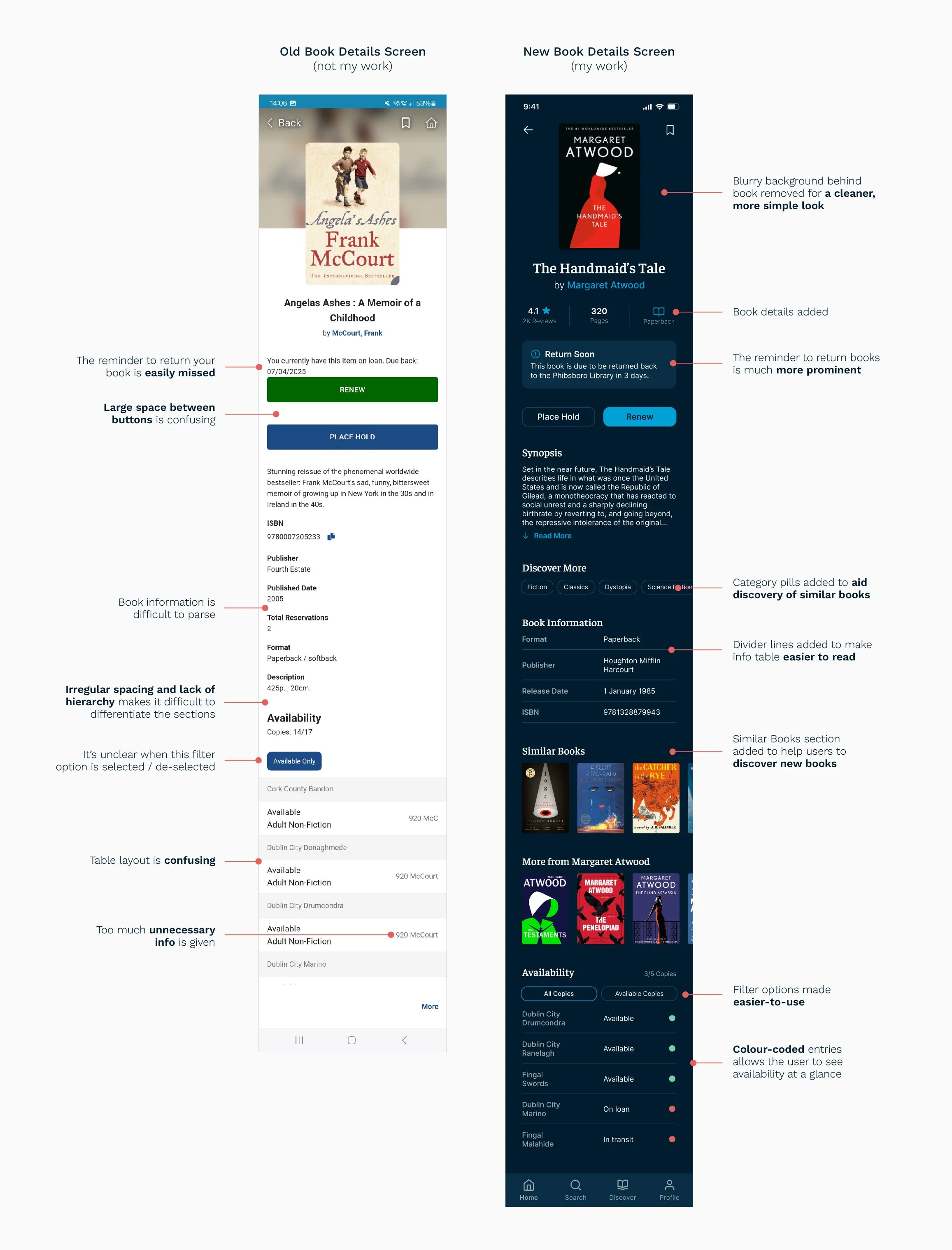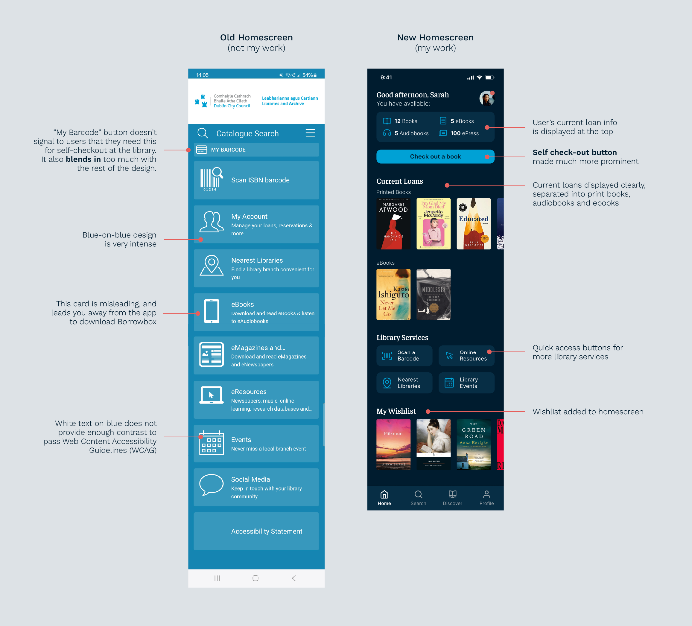 I decided to completely redesign the Dublin City library app, introducing some key features and quality-of-life improvements to improve library member’s experience. My primary goals were to: