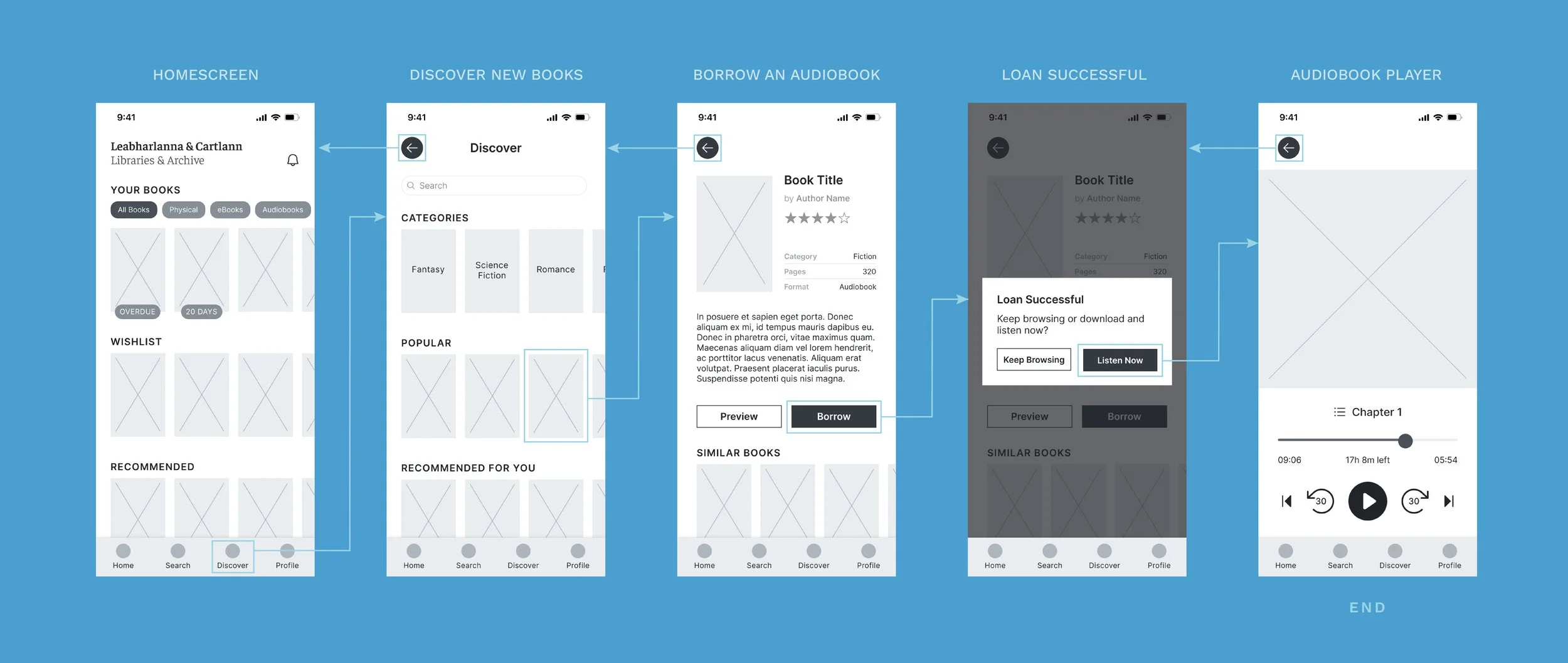This screen allows a library member to play an audiobook that they’ve borrowed from the library. It was very important to me to include this feature in the re-design, as currently a library member needs to download a separate app, Borrowbox, to gain access to the library’s digital audiobooks.