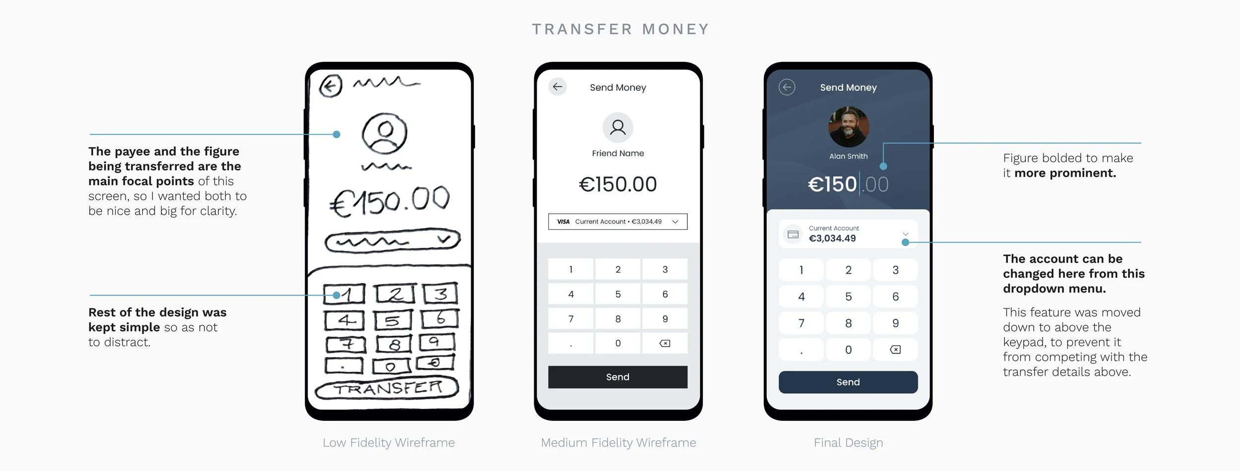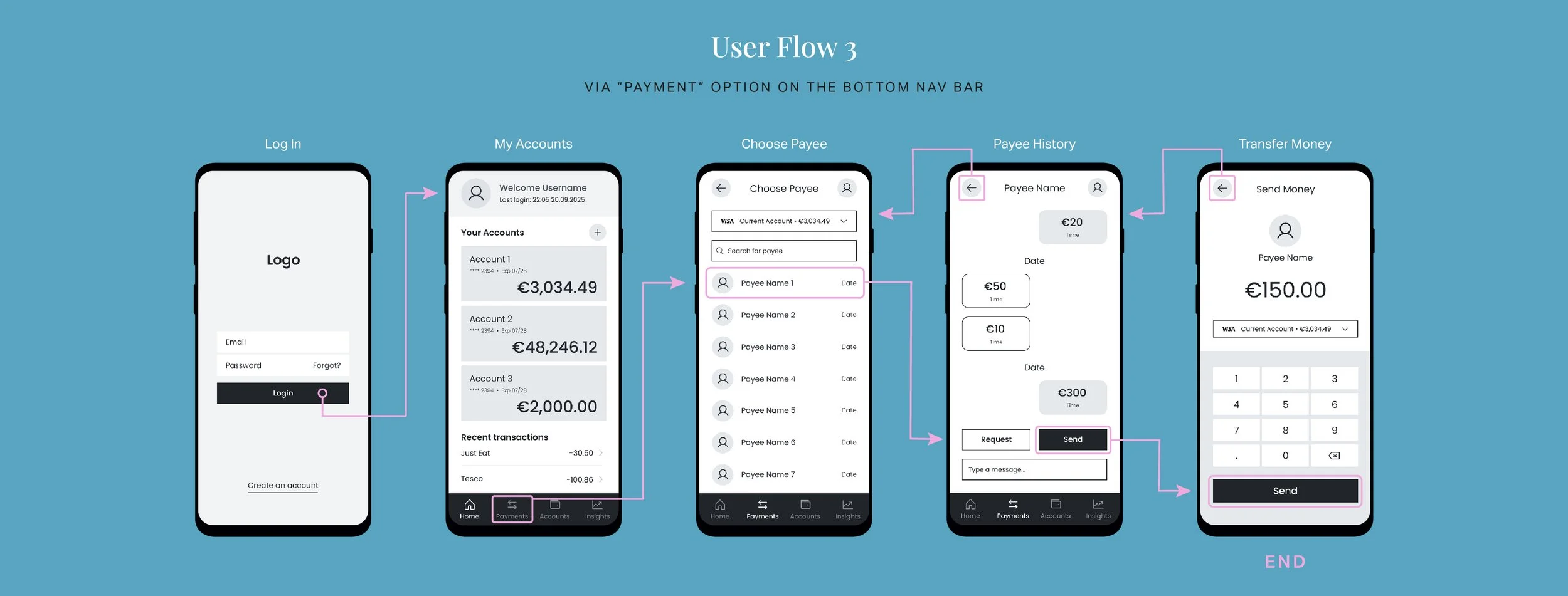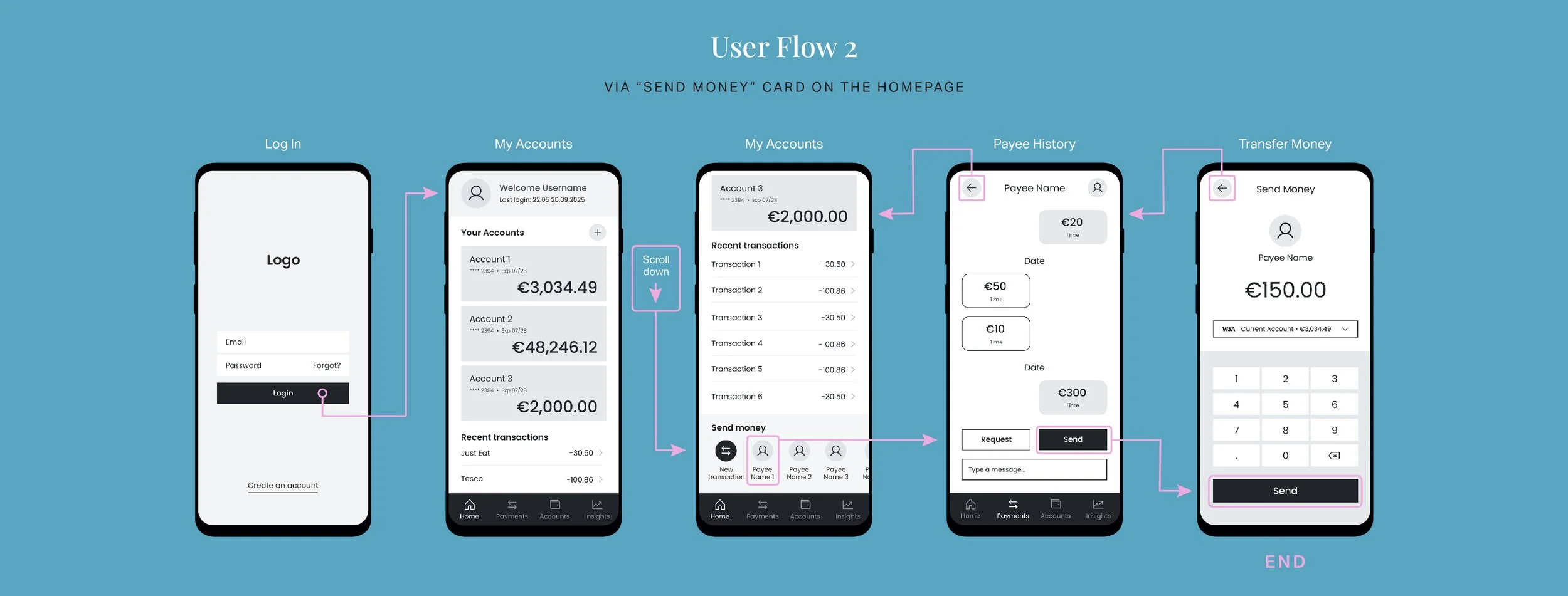 User Flow 2, as shown below, achieved the least amount of interaction needed - once logged in, the user would only have to quickly scroll down on the homepage to find the “Send Money” card, which would then bring them straight through the process of transferring money to a friend.