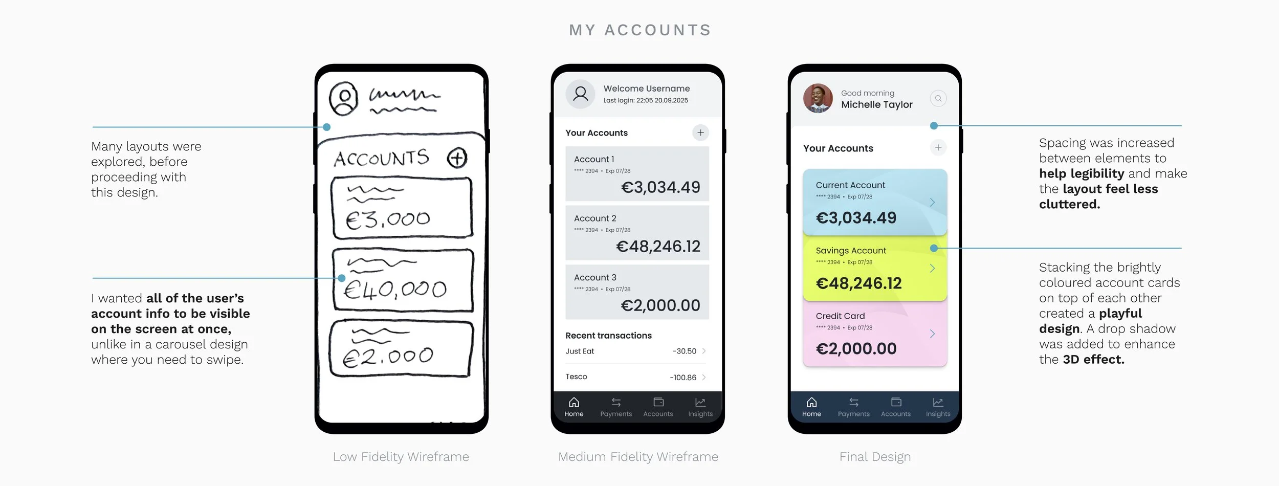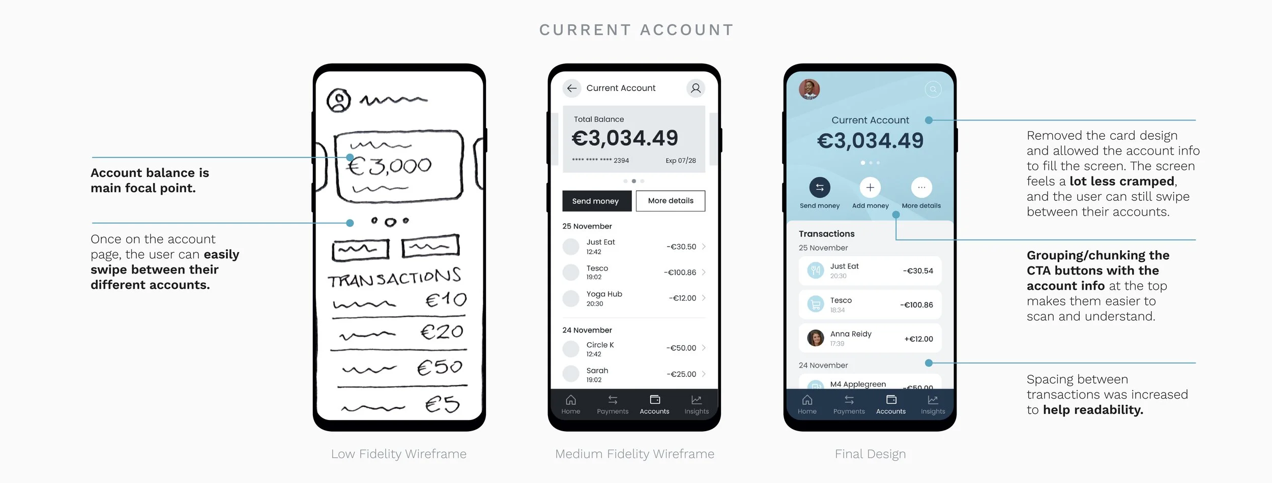 Focusing on just the My Account screen, you can see below how the design was tweaked and improved over time. I kept reiterating the layout, trying to make it as clean and simple as possible, while still retaining the important functions that a modern bank needs. Buttons were simplified, some distracting elements were removed, and the account cards were removed from their nesting.